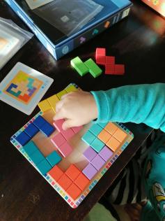 Le but : reconstituer un carré en utilisant la totalité des pièces. En fonction de la difficulté des défis, un nombre variable de pièces est déjà placé sur le plateau. Ici, mon fils de 3 ans réalise le premier défi.